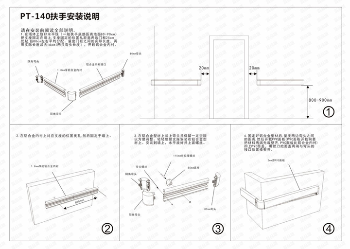 (老人院扶手,抗菌防滑扶手,酒店通道扶手)由四個(gè)部分組成,其中面板采用 PVC(聚氯乙烯材)料生成,材料長(zhǎng)度5米,厚度2.0MM,可定制顏色。底座和封口采用ABS合成樹(shù)脂擠壓生成。扶手內(nèi)部采用鋁合金材料,鋁合金長(zhǎng)度5米,有多種厚度可供選擇。