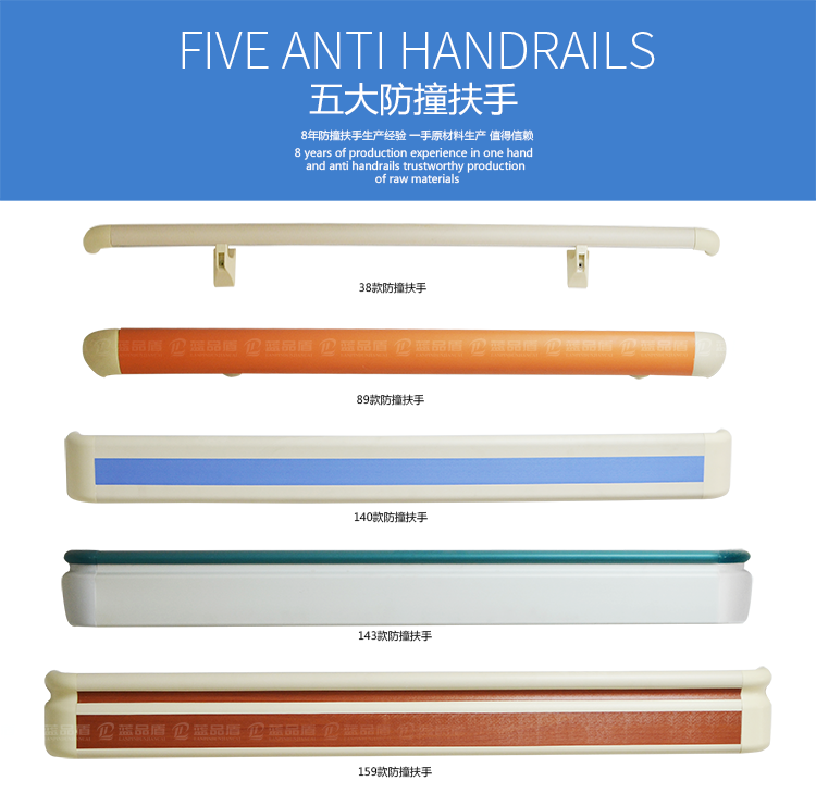 159安全抗菌扶手,醫用康復院扶手,婦幼醫院防撞扶手)由四個部分組成,其中面板采用 PVC(聚氯乙烯材)料生成,材料長度5米,厚度2.0MM,可定制顏色。底座和封口采用ABS合成樹脂擠壓生成。扶手內部采用鋁合金材料,鋁合金長度5米,有多種厚度可供選擇。